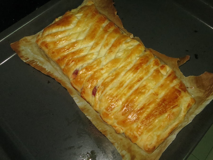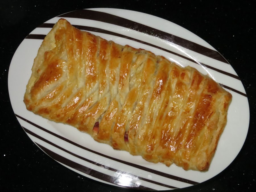 Estiramos la masa de hojaldre y la dividimos de manera imaginaria en tres partes, en el centro irán los ingredientes de la trenza, mientras que los laterales nos servirán para dar forma a nuestra trenza.