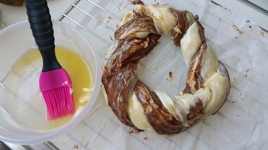 Untamos la trenza con un poco de mantequilla. Si lo preferís podéis pintarlo con huevo batido pero yo soy partidaria de no malgastar así los huevos.