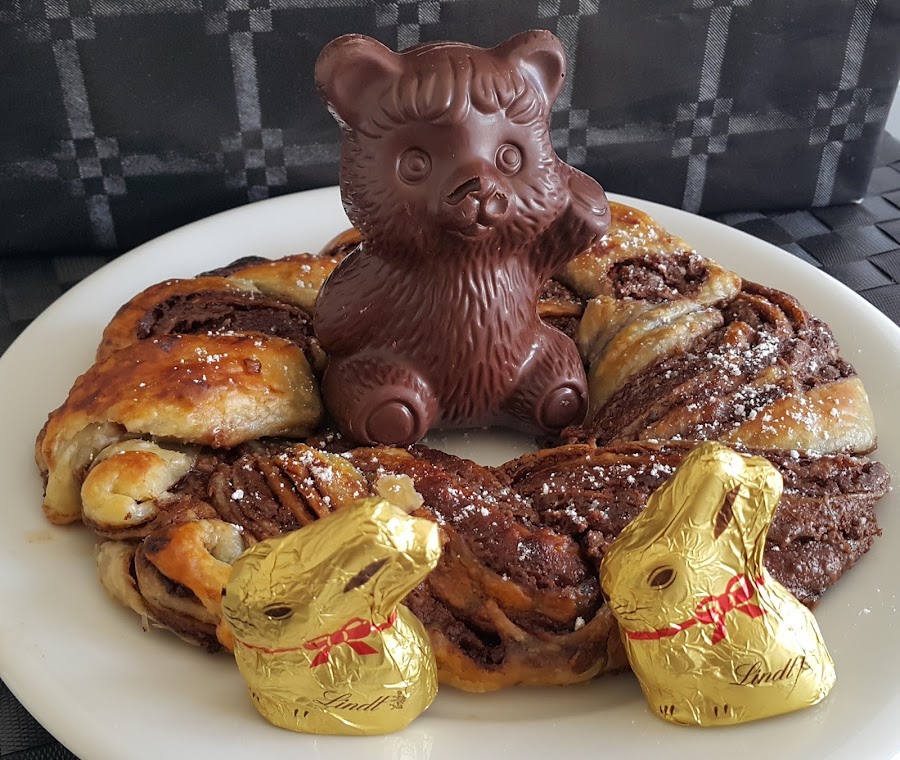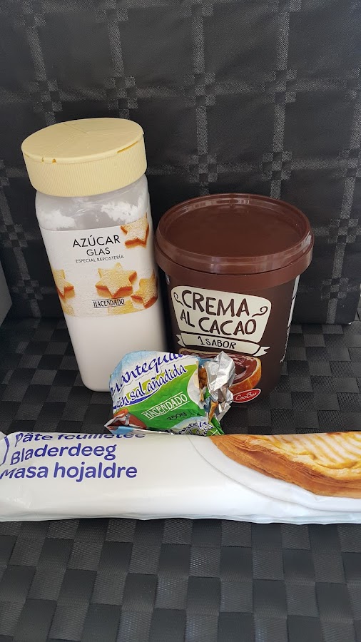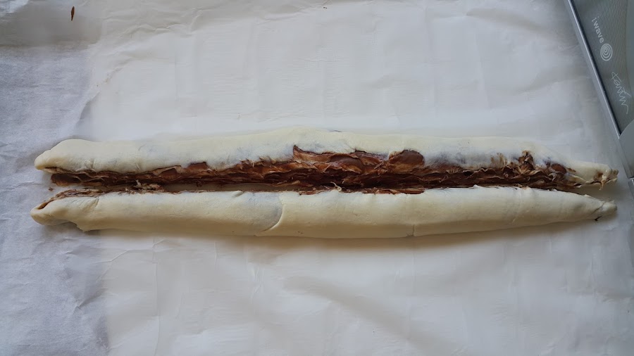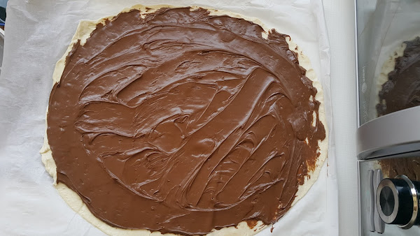 Lo primero que haremos será desenrollar la lámina de hojaldre y untarla generosamente con crema de cacao a temperatura ambiente. Yo probé el hojaldre de Carrefour pero debo decir que es muy mantecoso y para mi gusto está mucho mejor el de Buitoni.