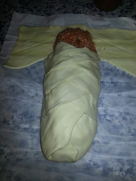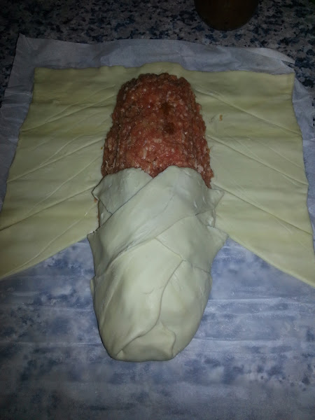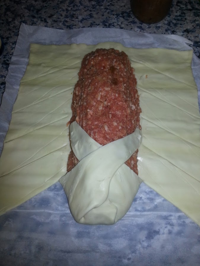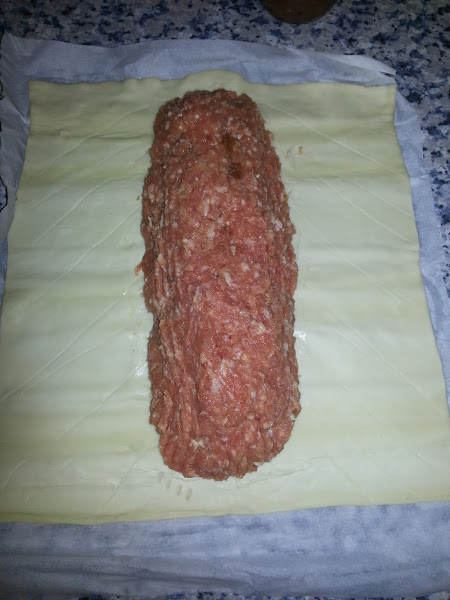 La elaboración es muy muy sencilla; primero estendemos la placa de hojaldre, que previamente la hemos sacado para que este a temperatura ambiente, y estendemos un tercio de la carne picada, que previamente hemos salpimentado, y en el centro disponemos una linea de queso de cabra
