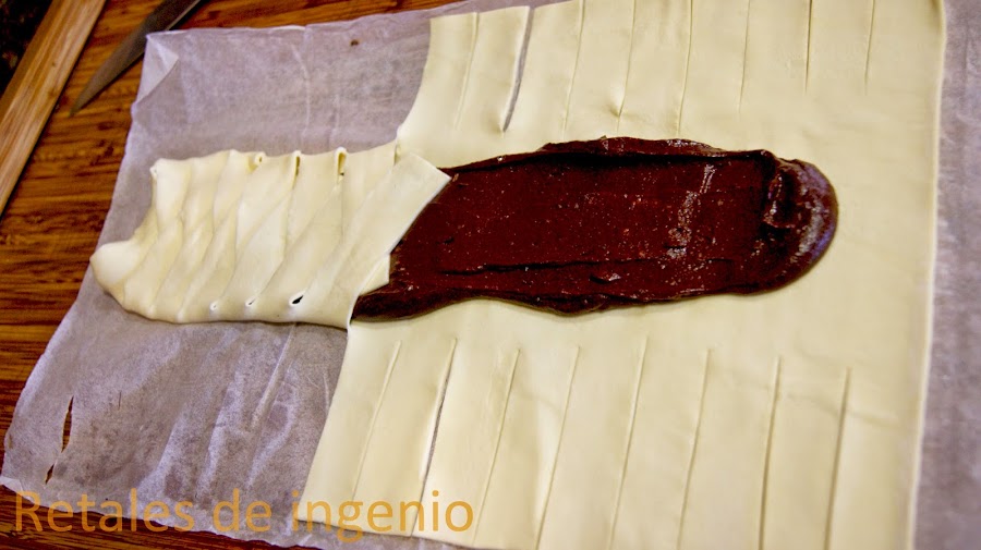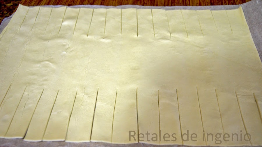 Se extiende una placa de hojaldre de la que ya viene estirada, (yo la dejo en el mismo papel de horno que suelen llevar), se le hacen cortes de unos 2 centímetros de ancho a cada lado, la misma cantidad en cada uno. Dejando el centro sin cortar, o sea que visualmente la placa estará dividida en tres partes iguales más o menos.
