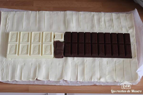 Abrimos el hojaldre sobre la lámina de papel vegetal que trae y colocamos la tableta de chocolate en la parte central del mismo, como se aprecia en la fotografía.