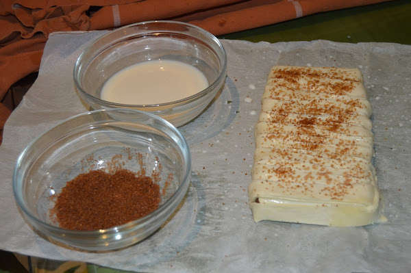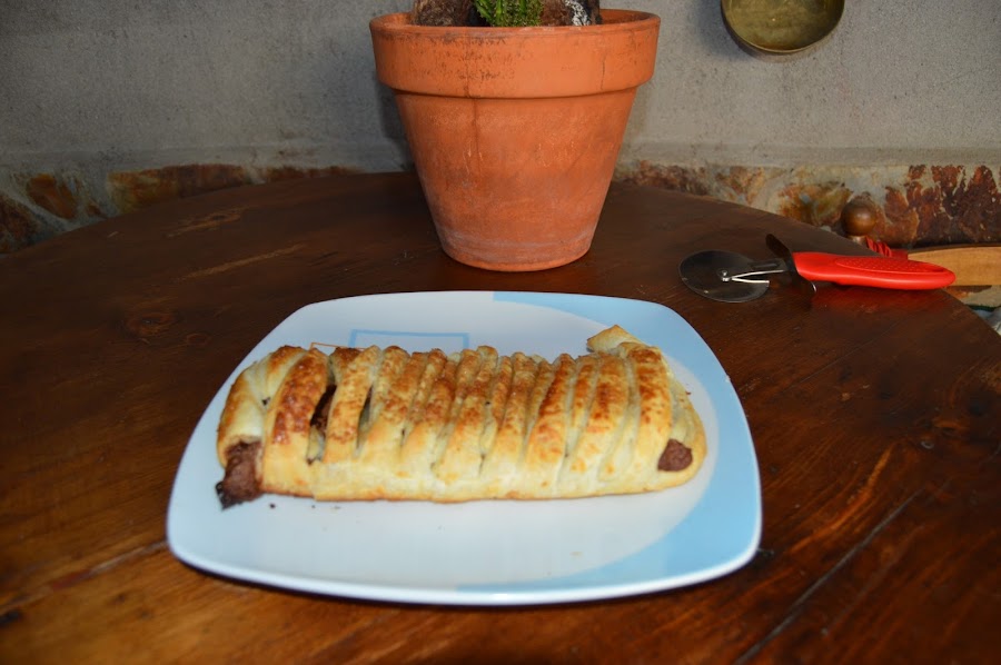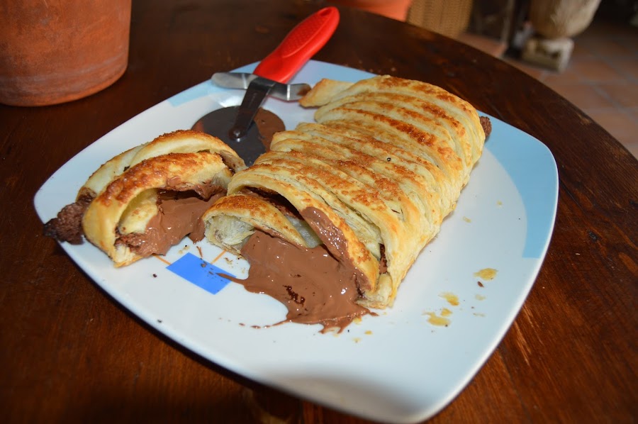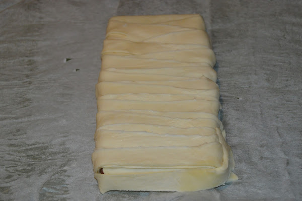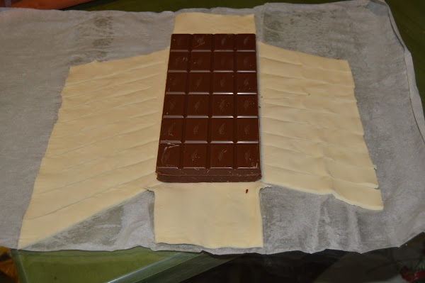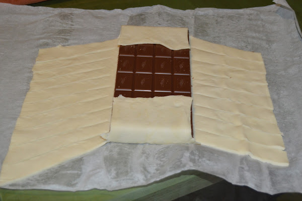 colocamos la tableta de chocolate sobre el hojaldre estirado, hacemos cortes en diagonal en los laterales (como aparece en las fotos) y retiramos el sobrante, vamos cubriendo la tableta hasta que no quede ningun trozo al descubierto.