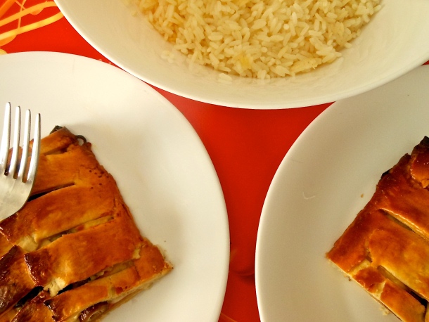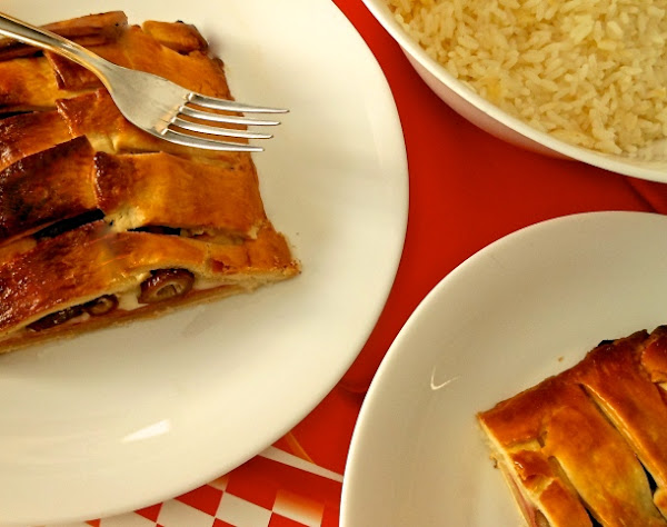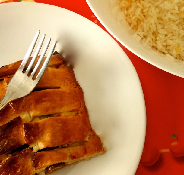 Sirve la empanada caliente o fría, acompañada del arroz.