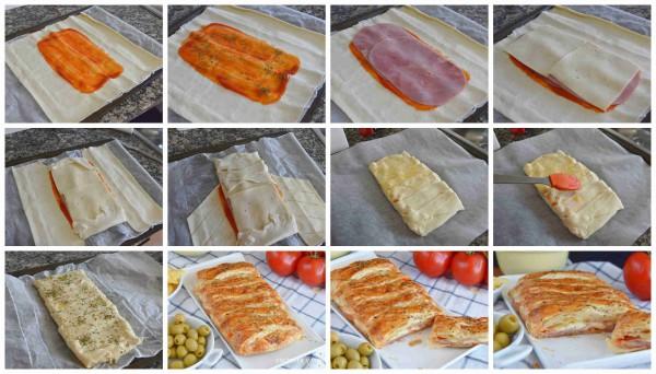 Y con la ayuda de un corta pizza hacemos unos cortes verticales arriba y abajo justo por donde tenemos el relleno y doblamos el hojaldre hacia dentro tapando el queso y el jamón.