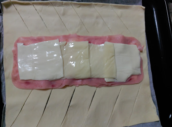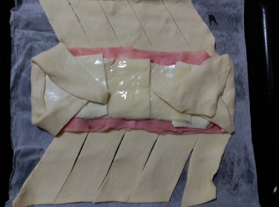 Vuelve a repetir la operación así quedará dos capas de jamón y dos de queso. Una vez hecho practica unos cortes longitudinales a ambos lados del relleno. Yo hice unos 6 cortes.