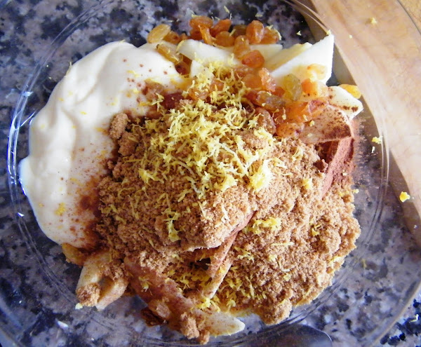 2. En un recipiente mezclamos la manzana, la natilla, el azúcar, la canela, el limón y las pasas.
