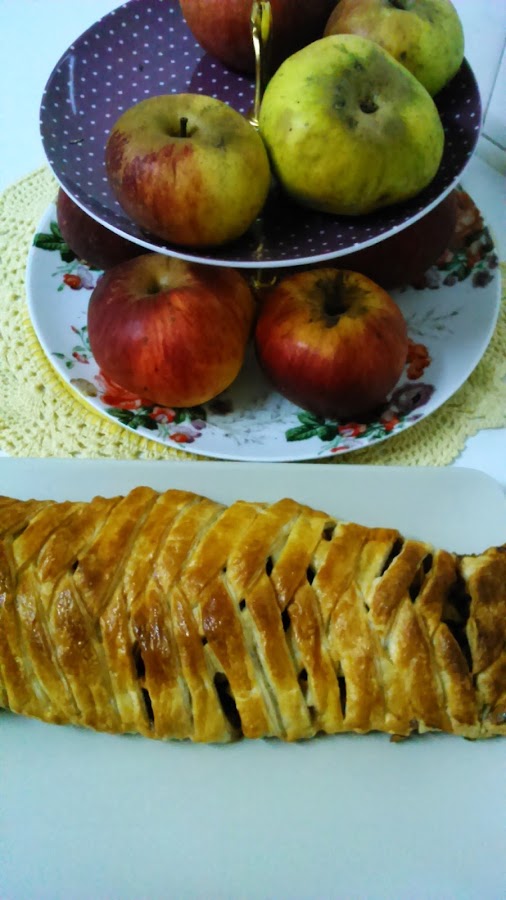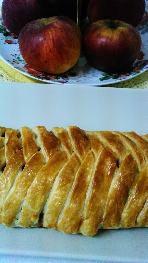 Hacer la trenza y cuando esté ya toda la manzana cubierta pintar con huevo batido. Colocar