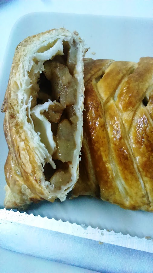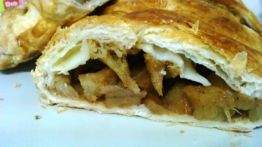 Colocar el hojaldre crudo en una bandeja de horno sobre papel de hornear, en el centro de la masa poner la manzana con las especias de manera que ocupe sólo el tercio central y los dos tercios que quedan uno a cada lado serán la cubierta.