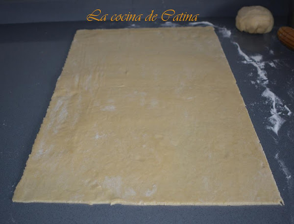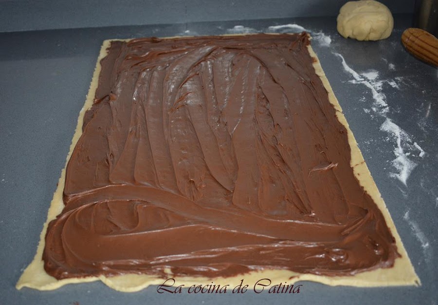 Sobre una superficie enharinada, extiende la masa con el rodillo y formar un rectángulo de la medida de tu bandeja de horno, cubrir con una capa fina de nocilla.