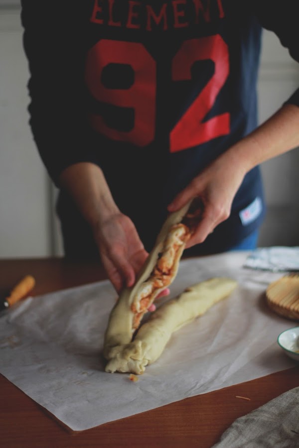 En casa nos gusta mucho estas ideas sencillas, deliciosas que se hacen en un momento y puedes rellenar de verduras, de queso, jamón, atún, dátiles o tiras de pollo. La cosa es que esta trenza sea una idea para que la hagas en casa con lo que tengas, pero yo te sugiero que pruebes la combinación de cebolla caramelizada, queso de cabra y tacos de pollo.