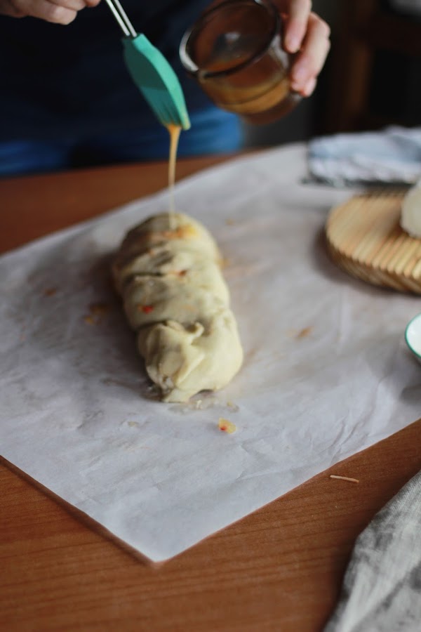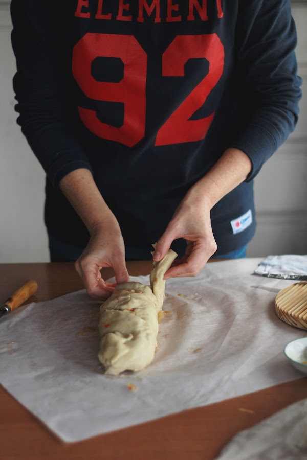 Enrolla la masa quebrada por completo, haz un corte longitudinal, dejando uno de los extremos sin cortar, enrolla cada mitad sobre si misma y ve trenzando,