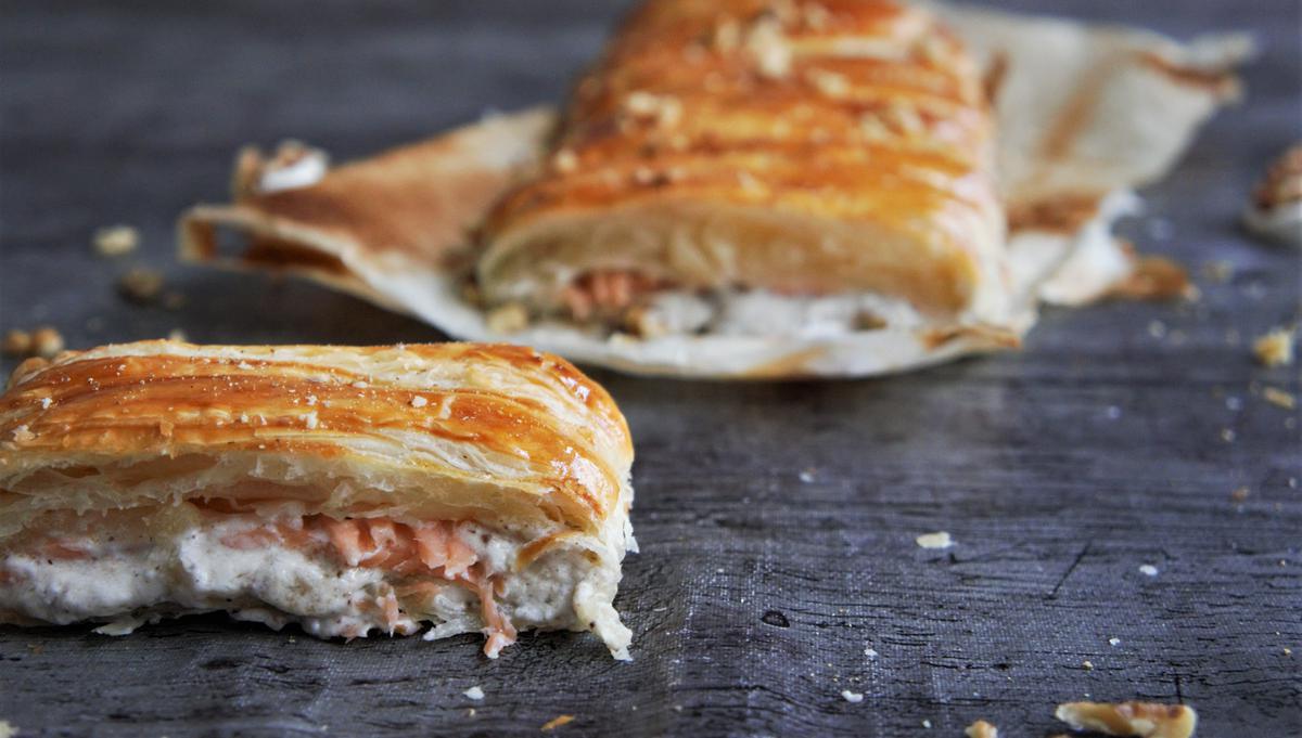 Extendemos la placa de hojaldre y en el centro untamos la crema de trufa ocupando 1/3 de la masa y dejando un dedo de hojaldre por encima y otro por debajo sin cubrir. Ponemos encima el salmón ahumado.