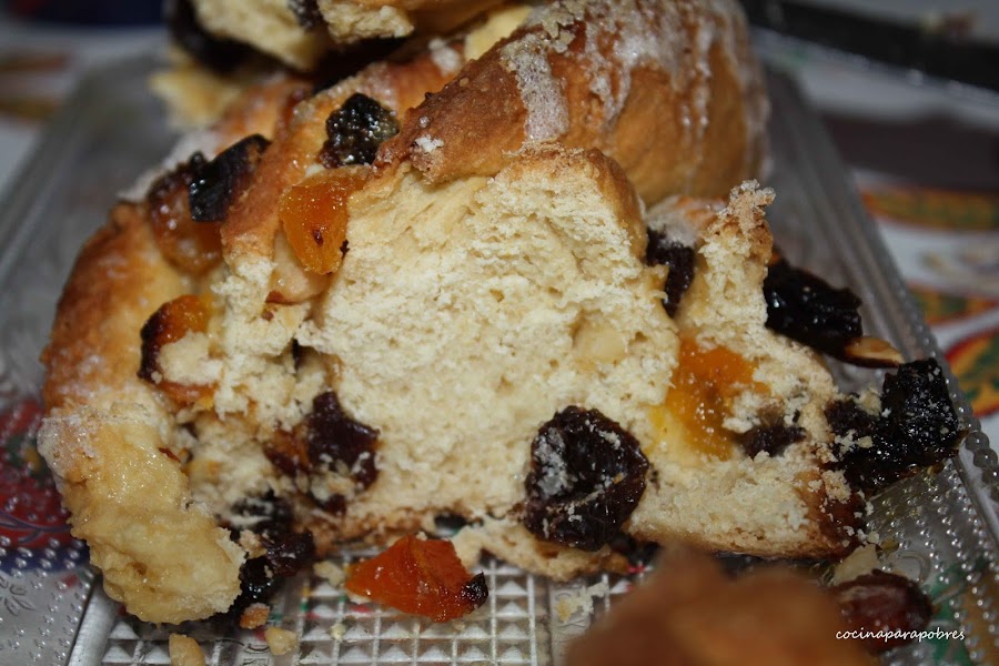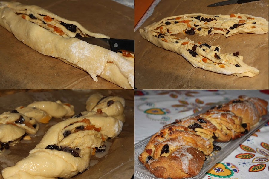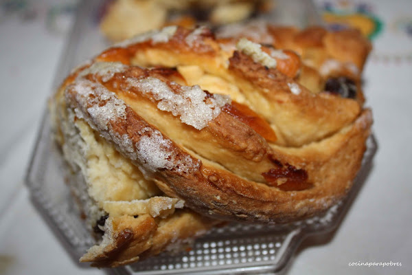 Derretimos la mantequilla y pintamos con ella la masa,repartimos los frutos secos, pasas, ciruelas pasas y orejones estos dos últimos troceados. Con la ayuda de las dos manos enrollamos la masa, consiguiendo un cilindro, con un cuchillo cortamos a lo largo por la mitad. Separamos las dos mitades y las vamos girando con cuidado, una sobre otra. Horneamos 30 minutos a 180 ºC, hasta que la superficie quede dorada.