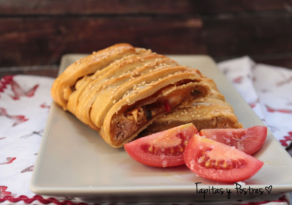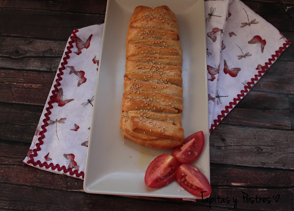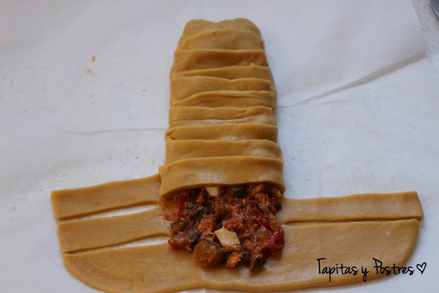 Ya tengo en el blog un par de empanadas, pero esta quería darle un toque distinto sin salirme de lo que gusta en casa (que es muy limitado, la verdad). Así que le he dado una forma distinta para que quede má atractiva.