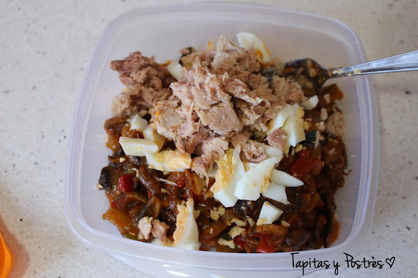 Una vez frío, le añadimos la lata de atún y el huevo cocido picado. Reservamos.