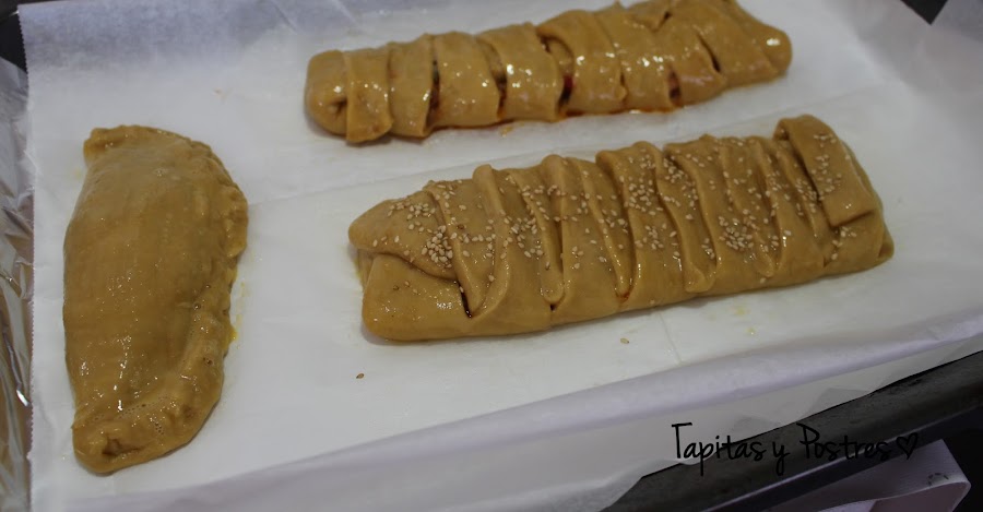 Pintamos de huevo y espolvoreamos con sésamo. Con estas cantidades me salieron dos trenzas y una empanada mini (no demasiado mini). Al horno.