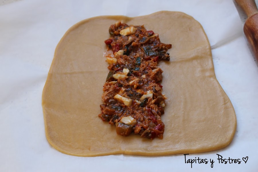 Hacemos dos partes, estiramos hasta dar forma cuadrada y ponemos parte del relleno en el centro.