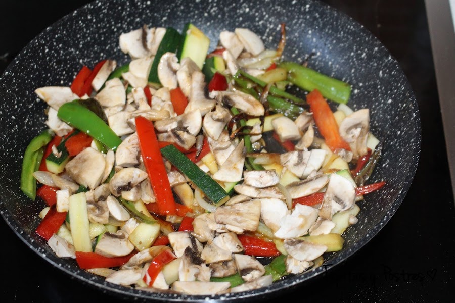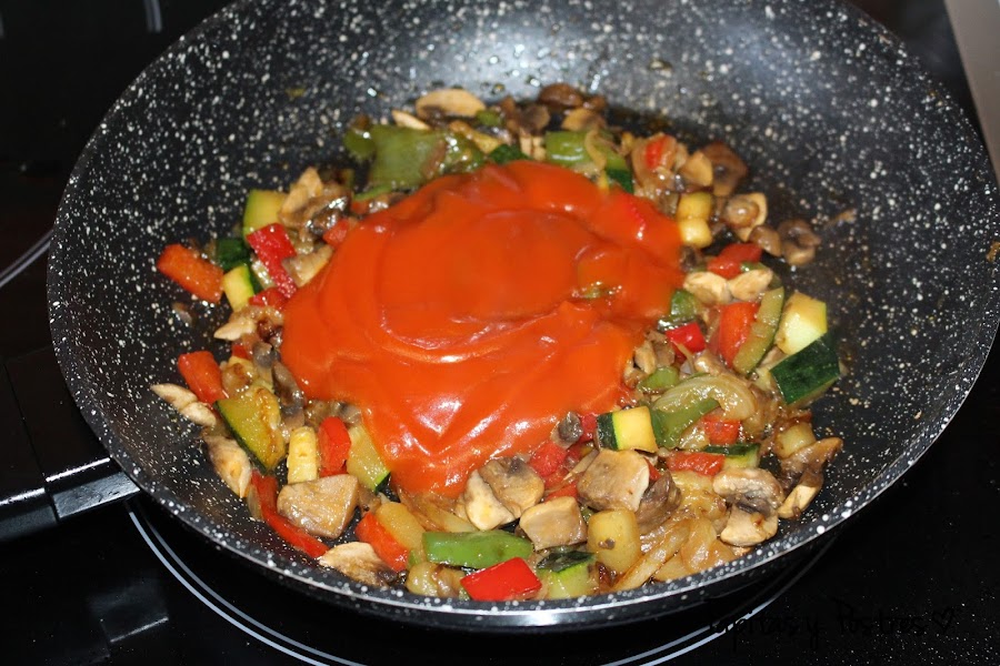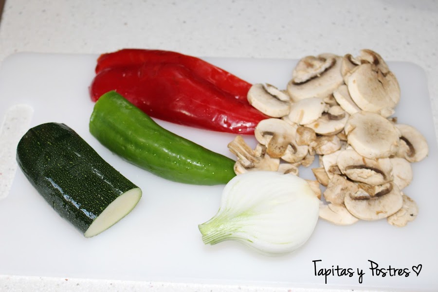 Primero haremos el relleno que tiene que estar frío cuando lo necesitemos. En una sartén con un fondo de aceite vamos a pochar la cebolla,el calabacín, el pimiento verde y rojo cortado a tiras. Cuando estén mas o menos tiernos, añadimos los champiñones troceados y dejamos que se sofría todo antes de añadir la sal, la pimienta y el tomate frito. Damos unas vueltas y dejamos enfriar.