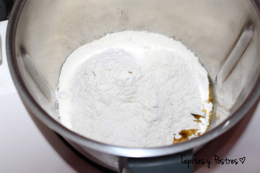 Vamos con la masa, en el vaso de la thermomix ponemos el aceite y el pimentón y calentamos 3 minutos, temperatura varoma y velocidad 2. Añadimos el resto de los ingredientes y mezclamos 20 segundos a velocidad 4. A continuación programamos 1 minuto a velocidad espiga.