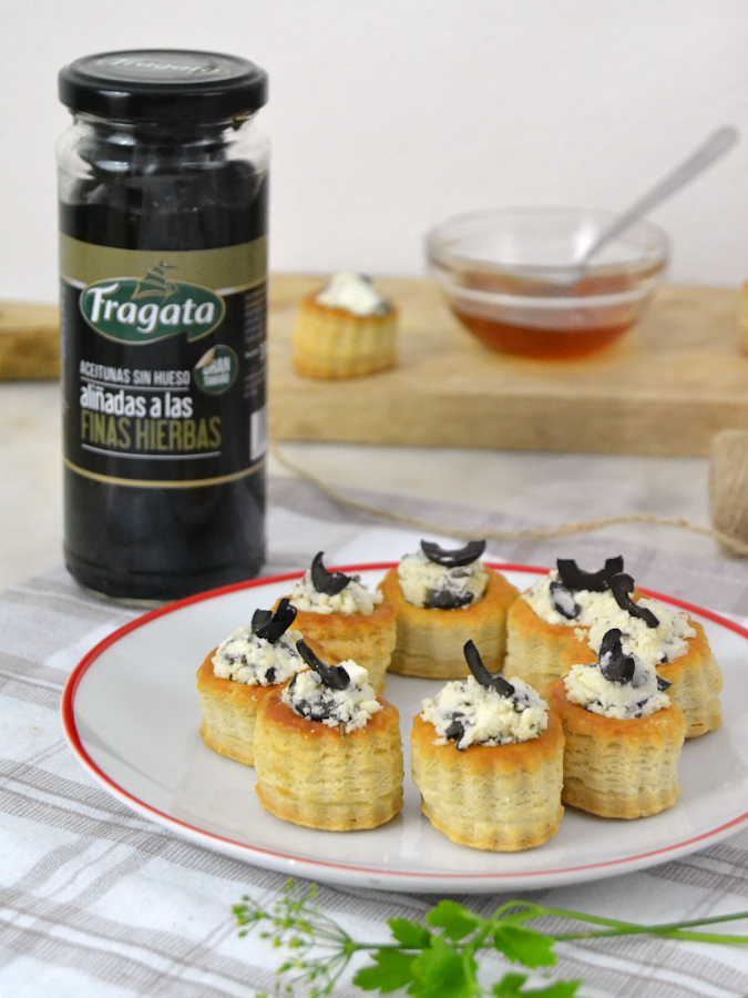 Tartaletas de aceitunas negras con queso feta y miel.