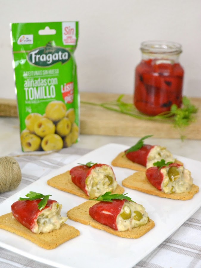 Para preparar este aperitivo solo tenemos que picar unas aceitunas, en nuestro caso de la variedad manzanilla aliñadas con tomillo, y las hemos mezclado con atún desmenuzado y un poco de mayonesa. Con esta mezcla rellenamos unos pimientos del piquillo. Para que se puedan comer más fácil los hemos servido sobre unas tostas de pan que además le aportan un toque crujiente. ¿A que suena delicioso?