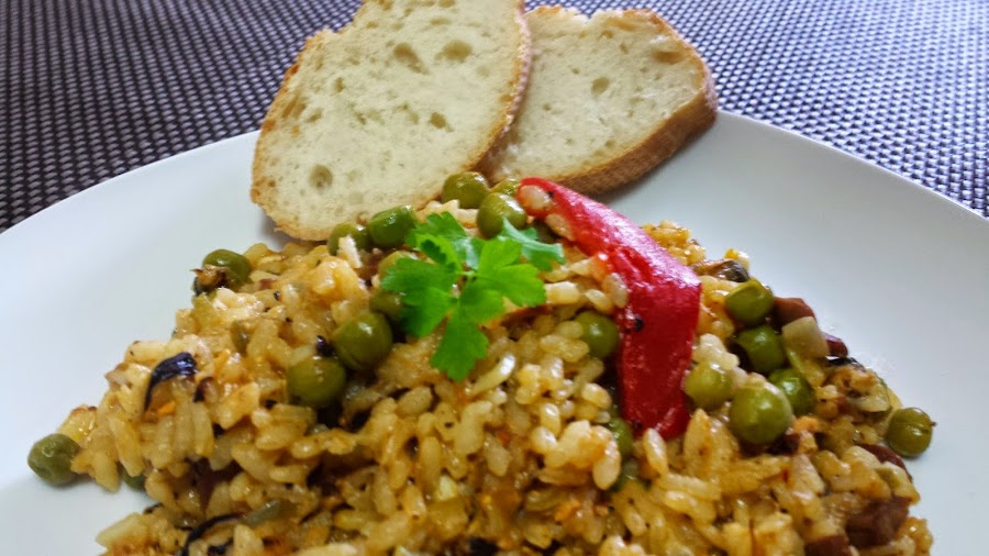 ARROZ CON CONSERVASNuestra segunda sugerencia es un plato de batalla puro y duro. Con conservas. LLeva arroz, mejillones, calamares en su tinta, verduras y caldo. Prepararemos un sofrito con las verduras, añadiremos las conservas bien escurridas y salteamos. Después los guisantes, el arroz, sofreímos un poco y añadimos el caldo.