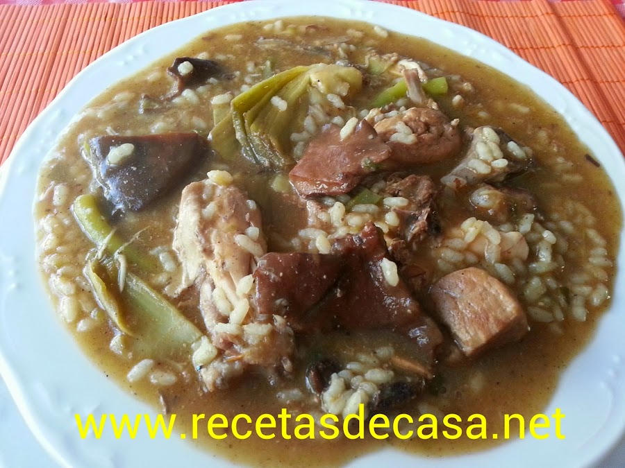 Para este arroz que queda muy sabroso necesitaremos varios tipos de carne (puedes elegirlos tú), arroz, verduras y setas. Doramos la carne y añadimos las verduras. Agregaremos agua o caldo y dejaremos cocer hasta tener la carne hecha. Por último, ponemos el arroz y mantenemos hasta que esté hecho.
