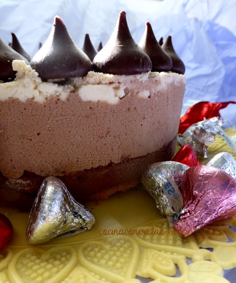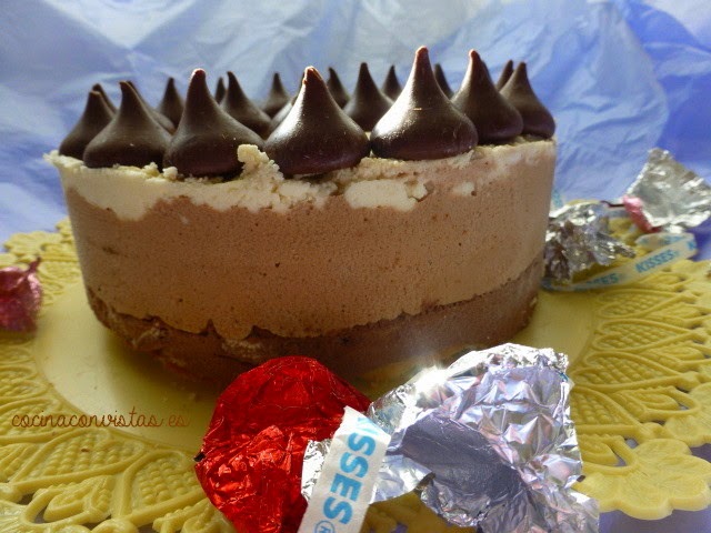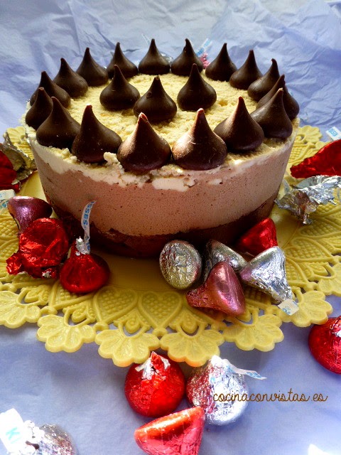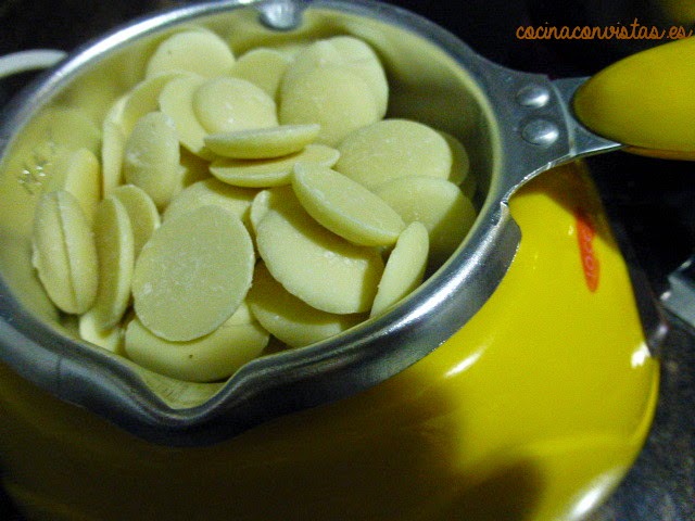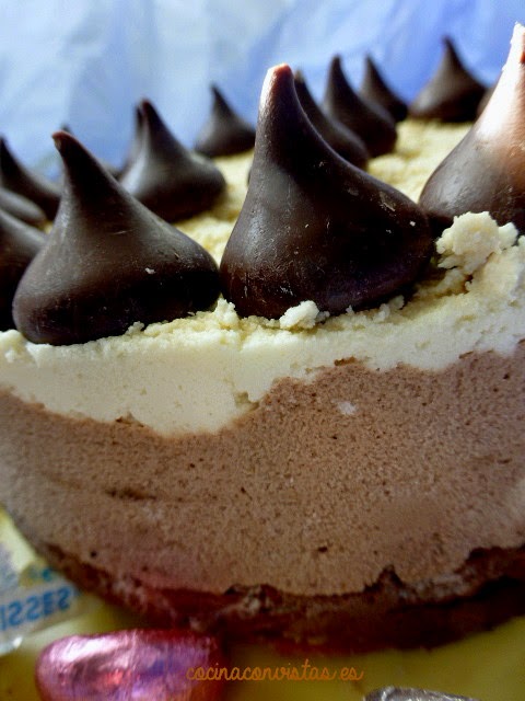 Si lo que utilizamos es un molde no desmontable el orden de los chocolates sería al revés para que al desmoldar la tarta (volteándola) quedase el chocolate blanco por encima.