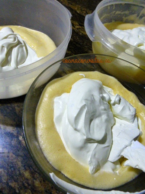 También al baño maría, batimos los huevos y la yema, y le añadimos las hojas de gelatina, continuamos batiendo hasta que se forma una crema esponjosa y... se retira del baño maría.