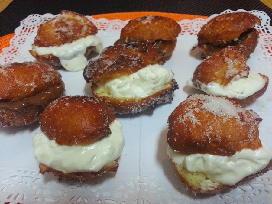 Los ingredientes principales no varían mucho respecto a las anteriores: harina, aceite, huevos, leche y el relleno elegido. Como siempre, prepararemos la masa y haremos bolas que dejaremos reposar un ratito. Por último se fríen y se rellanan con lo que más nos guste después de que estén frías, para no quemarnos. VER RECETA PASO A PASO: BOLAS DE FRAILE O BERLINESAS