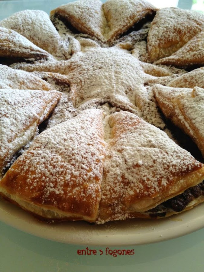 Otra combinación habitual y que queda muy bien es la del hojaldre y el chocolate. Entre 3 Fogones ha preparado una estupenda flor de hojaldre relleno. Para ello ha utilizado muy pocos ingredientes: hojaldre, huevo, azúcar y chocolate. Extenderemos la masa de hojaldre, sobre ella la crema de chocolate y otra masa de hojaldre. Nos queda hacer unos cortes, darle forma y hornear.