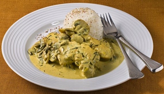 Cuando casi esté echo, quitamos el exceso de aceite, agregamos 150 gr. de nata (crema de leche) liquiday un poco de hojitas de estragón . Dejamos hasta que se trabe la salsa y acompañamos con arroz blanco cocido.