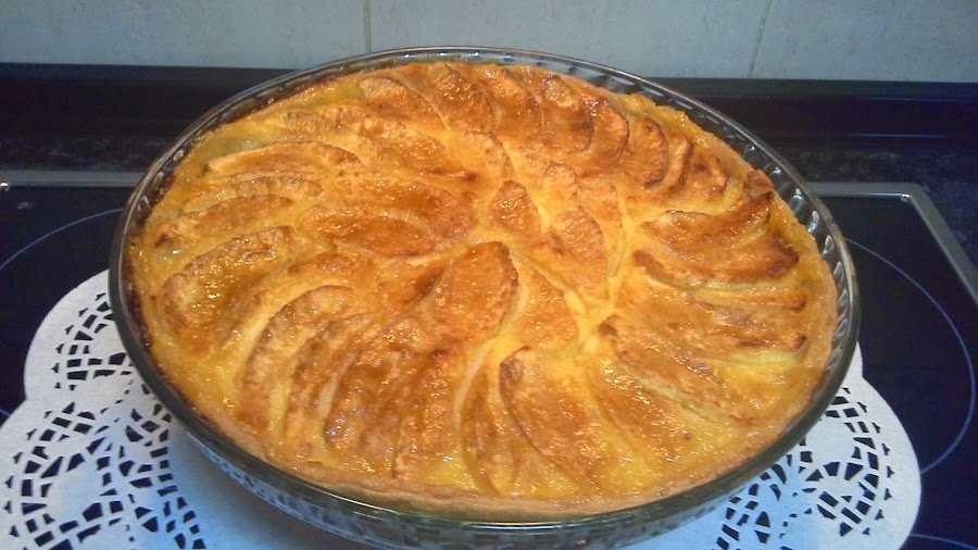 En esta segunda receta, la masa cubre totalmente la manzana y añade una crema de limón. Necesitamos masa quebrada, huevos, limón, nata (crema de leche), manzanas y azúcar. Prepararemos la crema de limón que verteremos sobre la masa quebrada extendida y sobre ella pondremos láminas de manzana. Puedes ver la receta completa en el enlace.