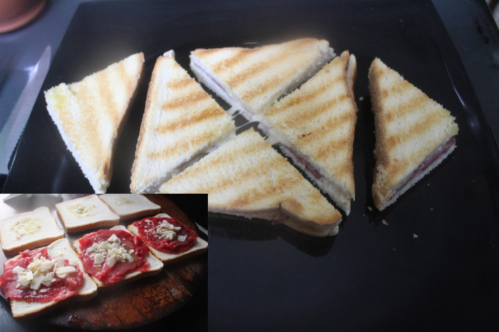 Sacar de la plancha y cortar en diagonal, de forma que de cada sándwich saquemos 4 triangulitos.