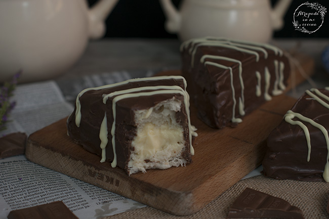 He repetido esta receta dos veces en una semana, la primera no me quedó tan bien la cobertura de chocolate y además las fotos no me convencían nada, por lo que los he repetido porque no quería dejar de poner esta magnífica receta. De pequeña no comía bollería porque nunca me ha gustado la bollería industrial, y por aquel entonces yo no hacía la casera, así que salvo alguna que otra torta de panadería, lo único que me gustaba eran estos triángulos, o en su formato de forma de caracola, que me volvían loca. Así que desde hace tiempo los tenía en pendientes y debo decir que se parecen mucho, pero mucho las cuñas a las originales. Quizás el chocolate varía un poco de sabor, pero lo de dentro, es igual al original. He cogido la receta de los triángulos de Megasilvita, aunque la crema pastelera le he puesto la que yo tengo publicada desde hace tiempo, el chocolate con leche de cobertura que he usado ha sido el de Nestlé Postres.