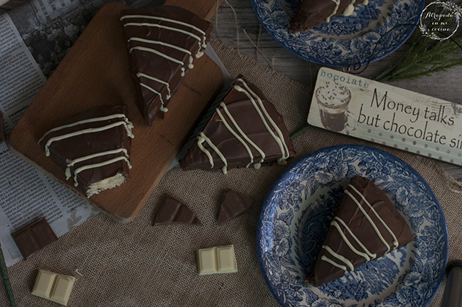 La primera vez hice todo el proceso el mismo día, y al rellenar el bollo a las pocas horas de salir del horno el corte no es tan fácil y los triángulos no quedan tan perfectos. Por lo que la segunda vez lo que hice fue hacer el bollo la tarde antes. También la crema pastelera. Y para el último día dejamos la terminación, es decir, rellenar de crema, enfriar un poco, cortar los triángulos y cubrir de chocolate.