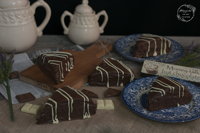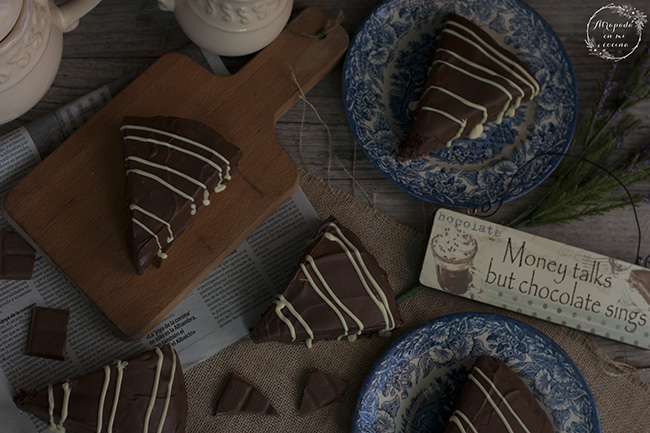 A la mañana siguiente abrimos la torta y rellenamos con la crema pastelera, tapamos y guardamos en la nevera durante una hora. Luego sacamos y cortamos en ocho cuñas. Disponemos éstas sobre una rejilla con un plato debajo. Calentamos el chocolate al baño María, añadimos a éste una cucharada de manteca de cerdo para hacerlo algo más líquido. Una vez derretido todo vertemos sobre las cuñas, ayudándonos de una espátula para asegurarnos que se vayan cubriendo por completo. Dejamos enfriar a temperatura ambiente un ratito.