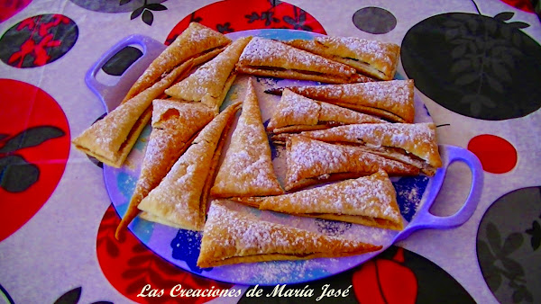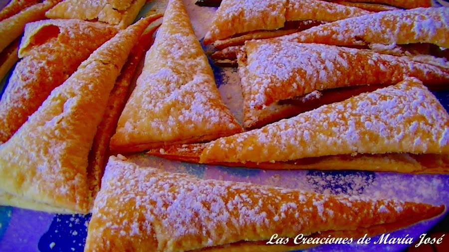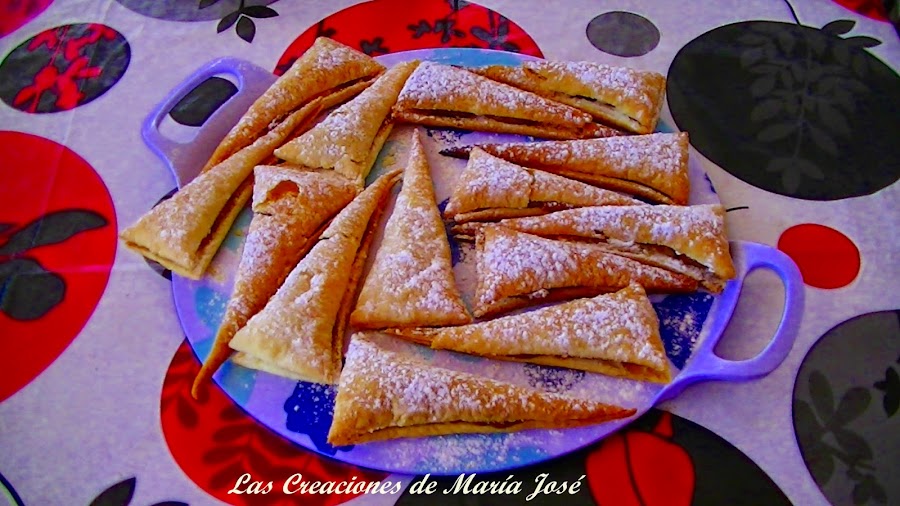 Estirar la masa de hojaldre, cortarla en triángulos, separarlos y meterlos al horno a 200º hasta que se hayan hinchado y dorado. Se dejan enfriar. Se abren a la mitad con cuidado para que no se rompan y se rellenan con dulce de leche. Se espolvorea azúcar glass y listos para comer. Muy fácil y muy ricos.