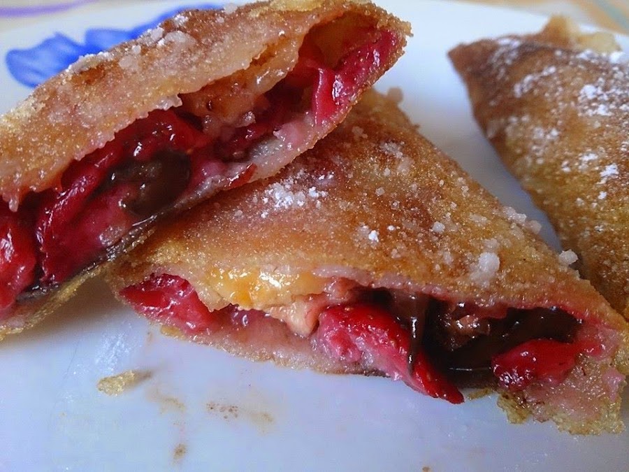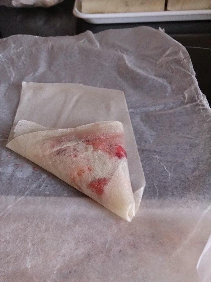 Uno de los días que hice rollitos de primavera me sobraron un par de láminas de masa filo, pensé que podría utilizarlas en hacer algo para el postre. Como tenía hechas unas fresas, cogí unas pocas y las puse a escurrir un poco, pero le dieron un toque muy bueno con el poco almíbar que le quedó.