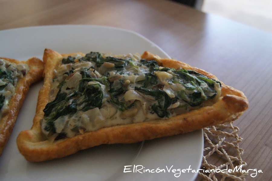 Sacamos los triángulos del horno y los rellenamos con las espinacas a la crema.