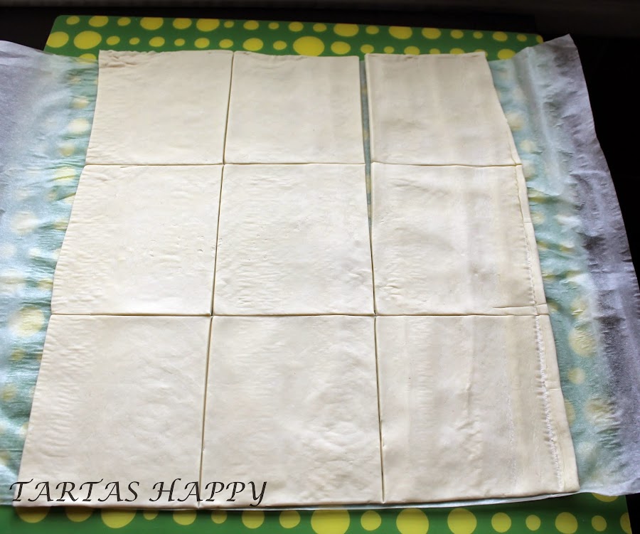 Cortamos nuestra lámina de hojaldre en cuadrados.