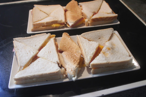 Convertimos cada sándwich en cuatro triangulitos, proporcionando a cada uno dos cortes en diagonal, para comerlos con más facilidad.