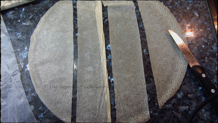Sacar las obleas de una en una para que no se se sequen. En mi paquete venían redondas pero a veces según marcas viene un rollo rectangular y se va desenrollando, mas fácil a la hora de hacer triángulos.