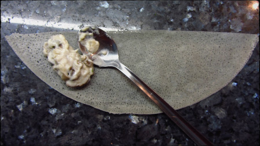 Ir poniendo un poco de relleno con ayuda de una cucharilla e ir formando el triángulo.