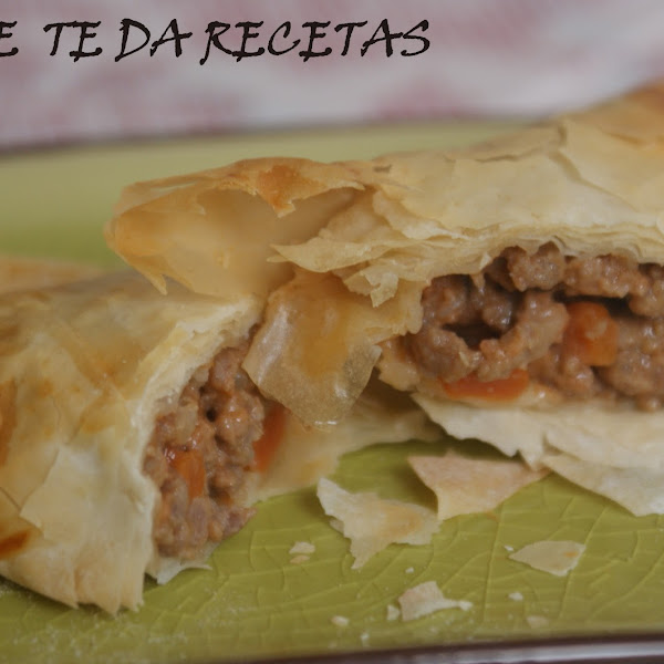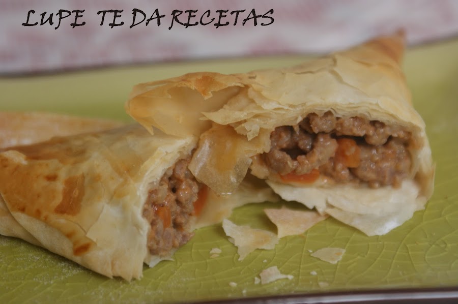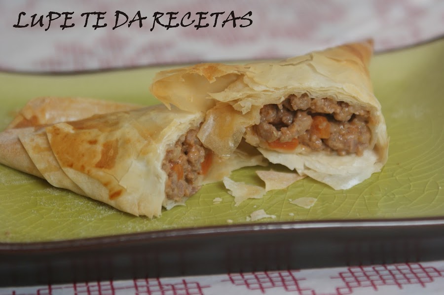 Cortar la pasta filo en dos o tres cada hoja a lo largo para poder hacer los triángulos. Poner una cucharada de la mezcla al inicio de la franja de la pasta filo, doblar en forma de triangulo e ir doblando sobre si misma siempre en triangulo hasta acabar. Repetir hasta terminar la carne.