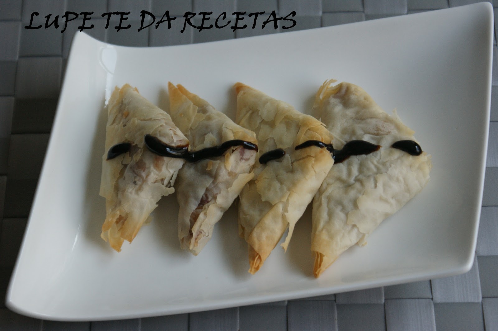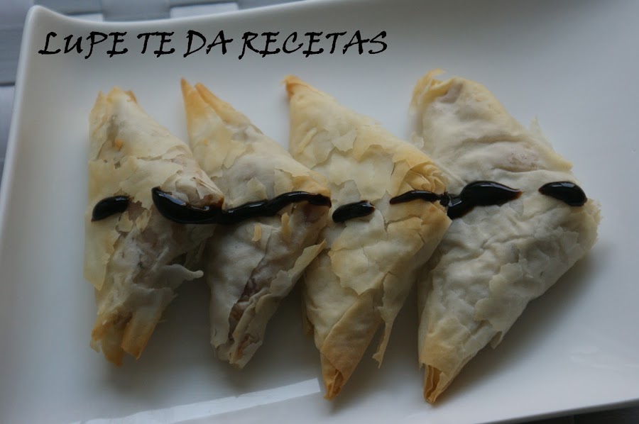 Este es un canapé que preparo muy a menudo, pero suelo hacerlo en saquitos, en este caso como tenía que preparar mucha cantidad he preferido hacerlo en triángulos porque con memos cantidad de pasta filo preparo más cantidad de canapés Y esto es así porque con los saquitos debo poner 2 ó 3 hojas de pasta para que no se deshaga en el horno al calentarse, sin embargo los triángulos al ir envueltos sobre si mismos con una hoja es suficiente.