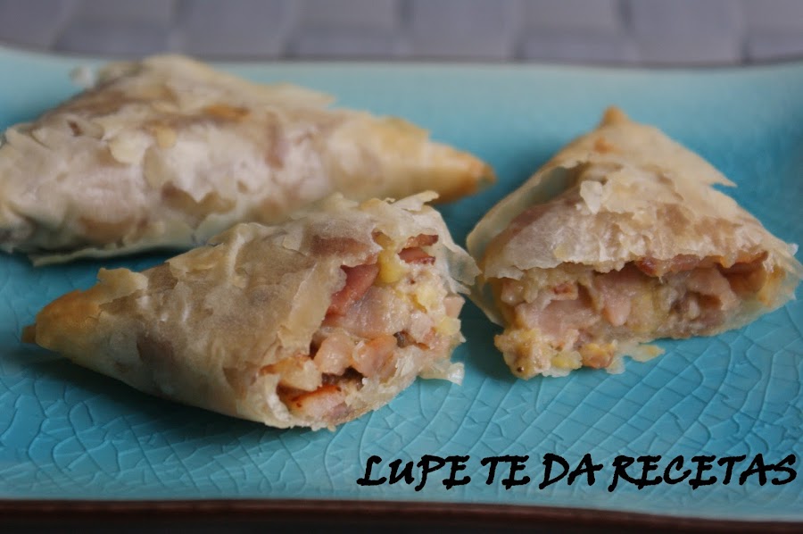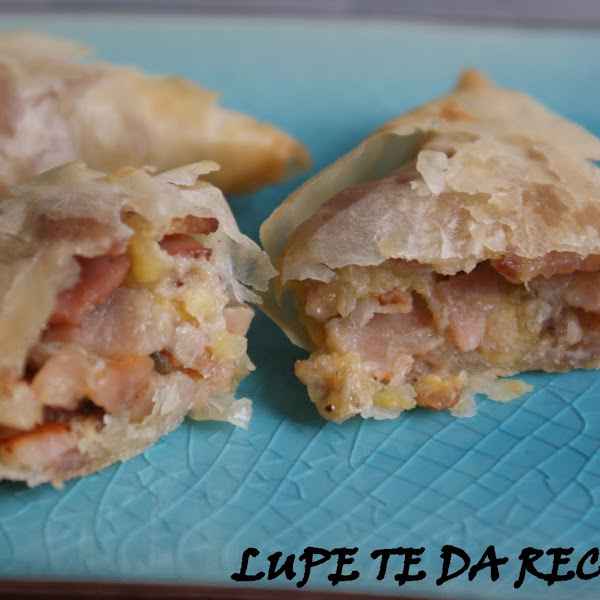 Poner las obleas de pasta filo sobre la encimera y cortar en tres o cuatro tiras a lo largo de la hoja de pasta según se quieran los triángulos de grandes, colocar encima de la pasta una cucharada de la mezcla e ir envolviendo en forma de triangulo sobre si misma de forma que se formen varias capas sobre la mezcla.