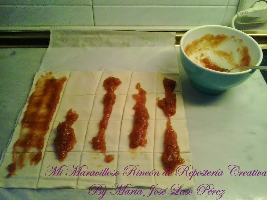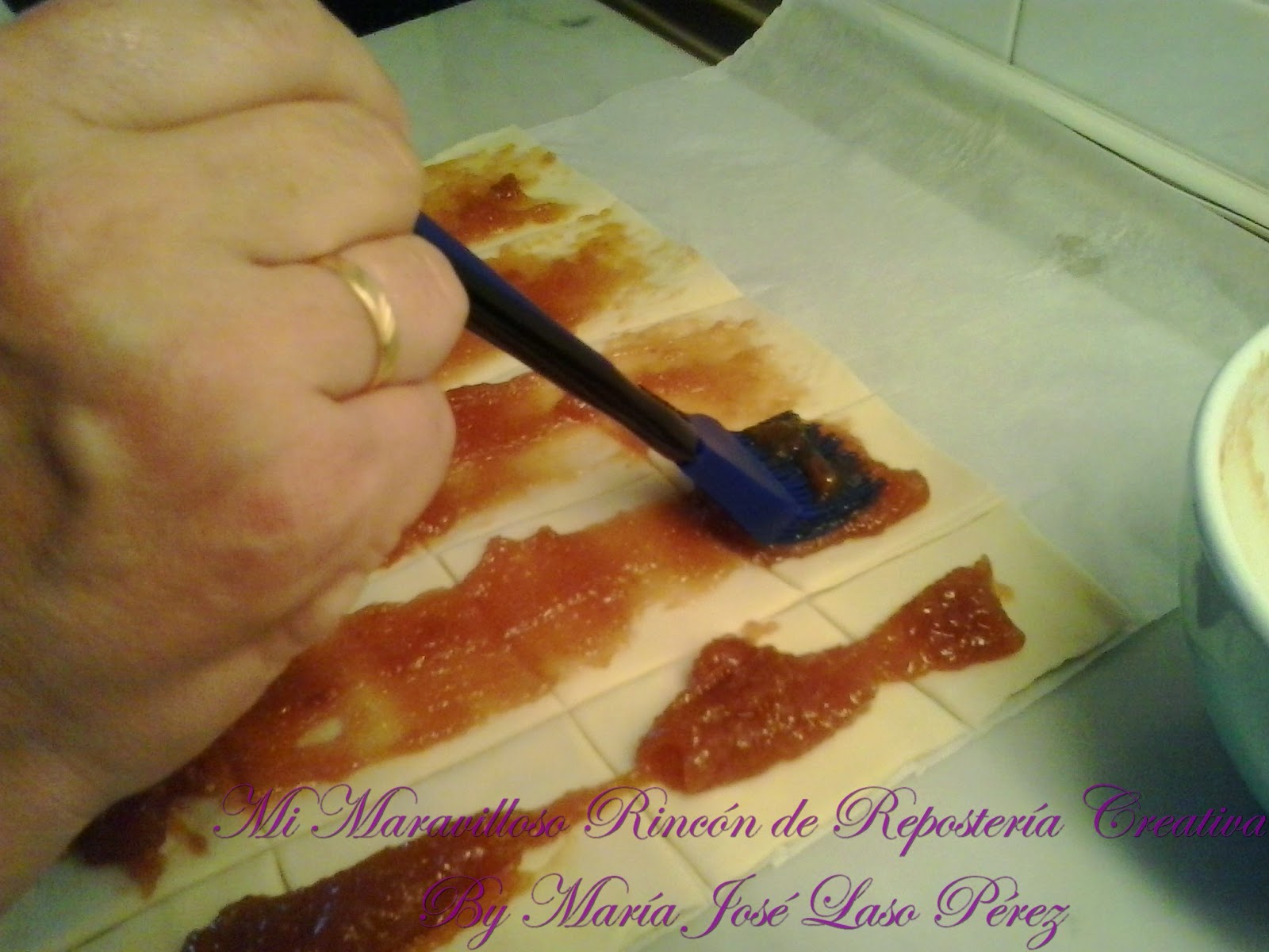 Echamos la compota encima del hojaldre y la untamos por toda la lámina, con un pincel de repostería.
