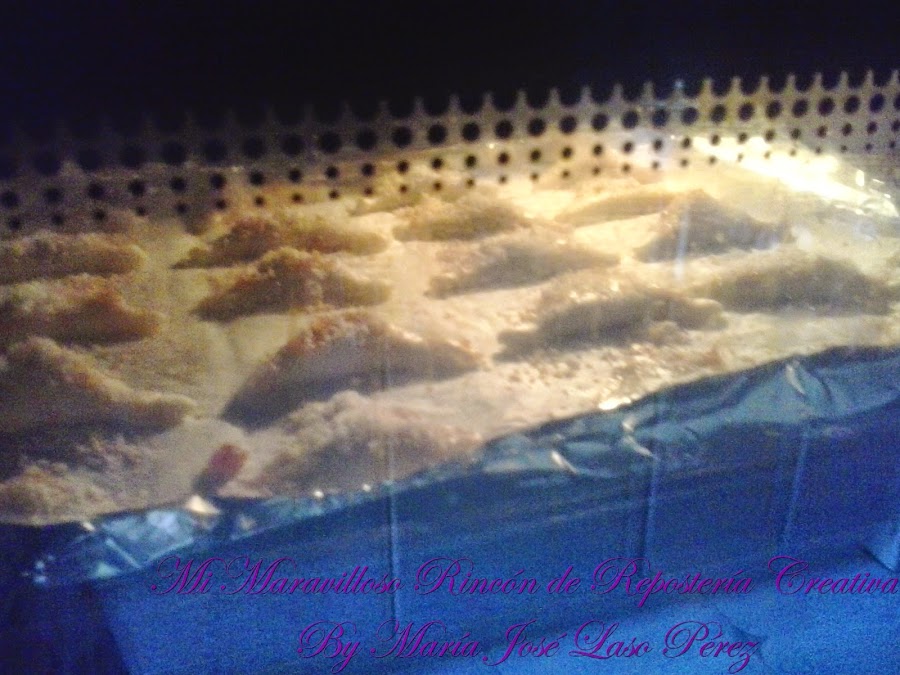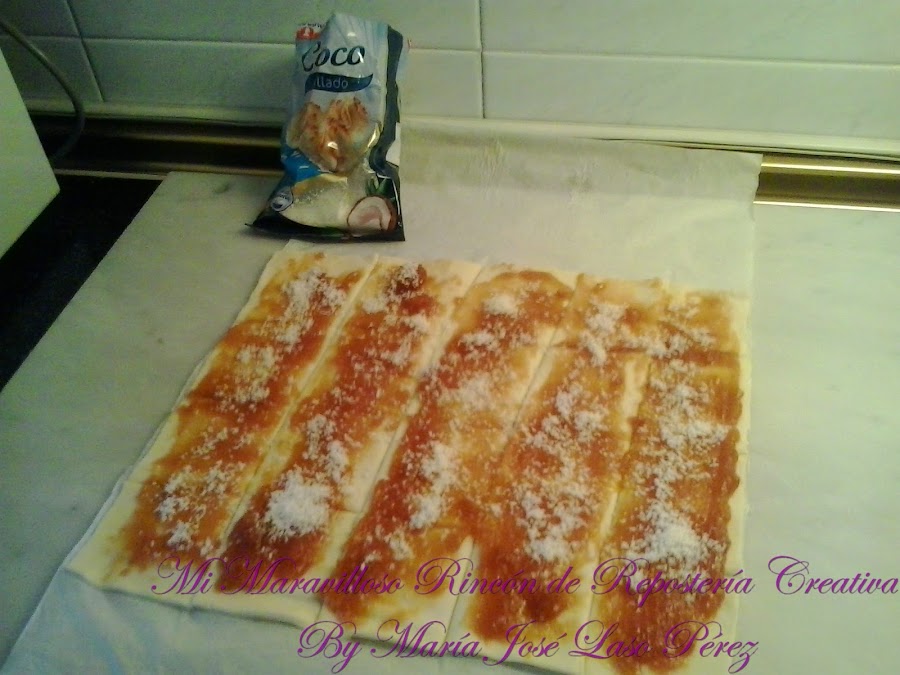 Expolvoreamos de nuevo con coco rallado y lo metemos al horno durante 15 a 18 minutos (eso debéis vigilarlo, como siempre digo ¡cada horno es un mundo!) o hasta que veáis que se empiezan a dorar por arriba. No esperéis mucho porque el hojaldre se quema rápido.